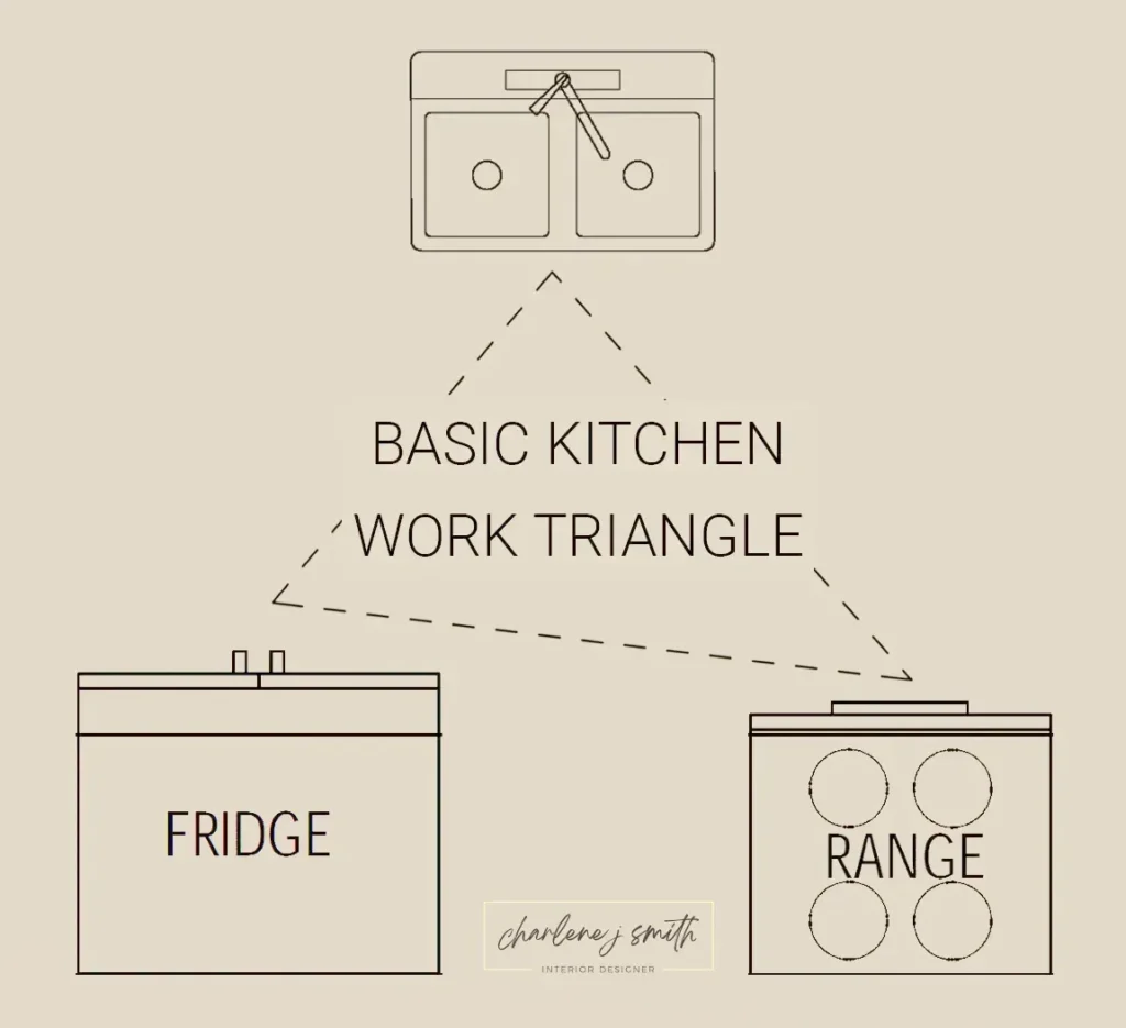 The kitchen work triangle connects the fridge, sink, and cooktop/oven—the three main work zones. For maximum efficiency: